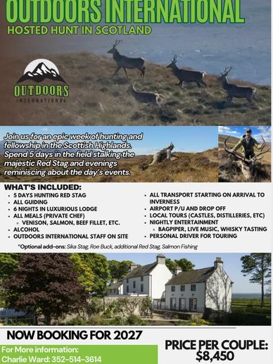 This exceptional Scottish Highlands package offers couples hunting the pursuit of Red Stag, Sika Stag, or Roe Buck while delivering an equally unforgettable experience for non-hunters. While hunters are in the field, non-hunting guests enjoy curated days exploring the breathtaking Highlands—historic estates and castles, scenic countryside, Loch Ness, and local culture—ensuring every guest is fully immersed in this luxury hunting experience.